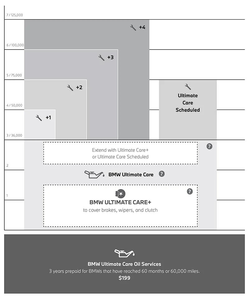 Disclaimer: The BMW Ultimate Care Oil Services plan includes unlimited oil and oil filter changes for three years for $199.00 plus taxes and disposal fees where applicable. Unlimited oil services included are based upon the associated BMW vehicle Condition Based Service (CBS) system. Non-CBS vehicles: annual low-mileage oil changes are included as outlined in your BMW Maintenance Booklet. Available for all BMW vehicles that have reached 60 months or 60,000 miles and have no current Ultimate Care + coverage. Plan is available for purchase once BMW vehicle has reached 54 months and has current BMW Ultimate Care Scheduled or BMW Ultimate Care +2 coverage.