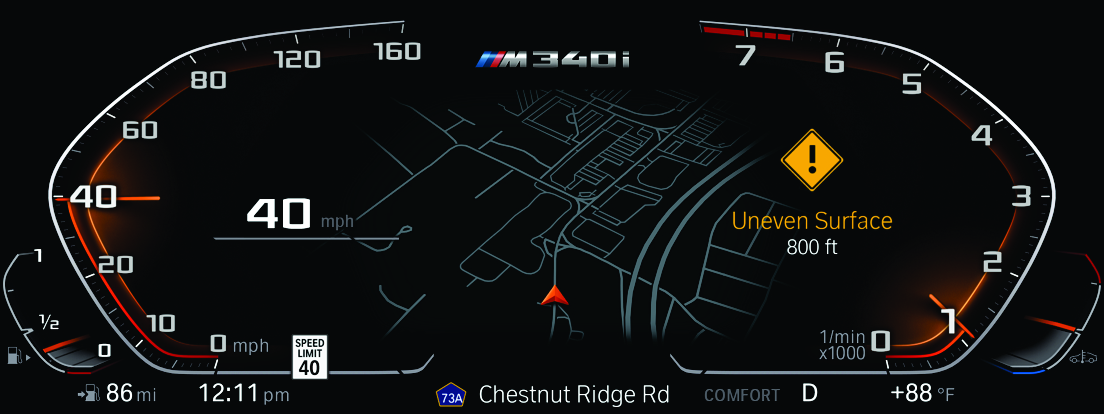 Uneven Road Surface continuously learns and automatically registers road imperfections and sends anonymized data directly to BMW, improving this feature in real-time for all BMW customers.